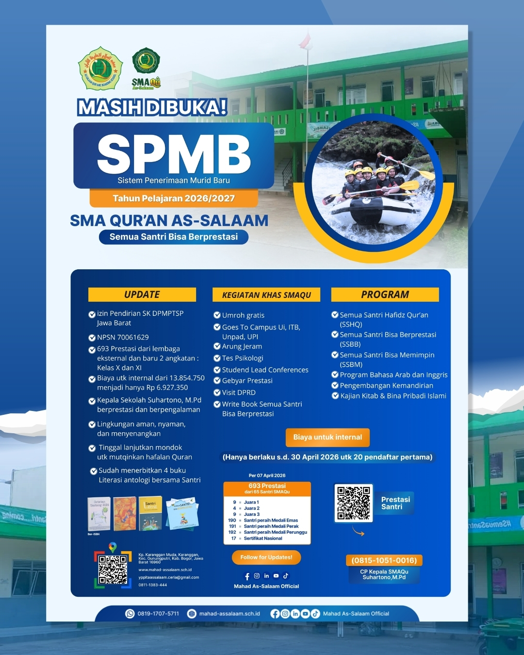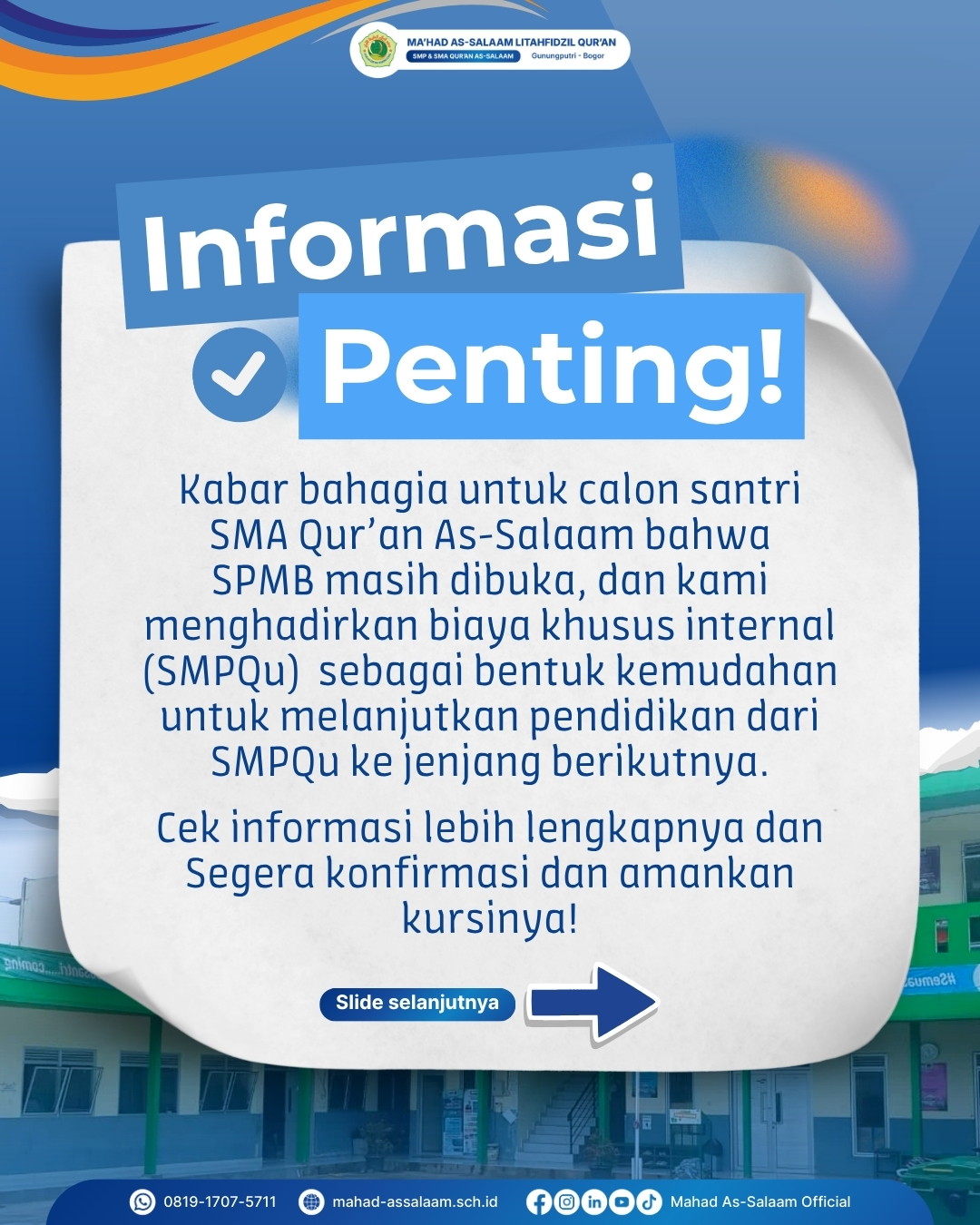 As-Salaam menghadirkan pembelajaran bidang akademik yang terintegrasi dengan nilai-nilai Islami danmemiliki target hafalan Al-Qur’an.Tersedia halaqoh khusus program tahfidz Al-Qur’an dengan target capaian hingga hafalan 30 Juz selama 3 tahun.
